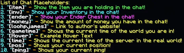 物品展示:在聊天中输入 [item]、[inv]、[ender] 等关键词,可向其他玩家展示手中的物品、背包或末影箱内容,并支持自定义布局。